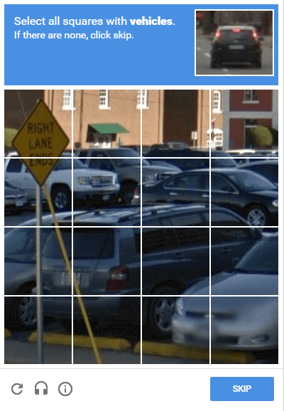 ReCaptcha v2 od Google to ta, która prosi użytkowników o kliknięcie elementów na zdjęciu: