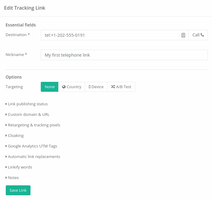 - Tel links are compatible with most Linkly features, including tracking, targeting, link rotator, device targeting, geotargeting, retargeting, custom domains and data export.