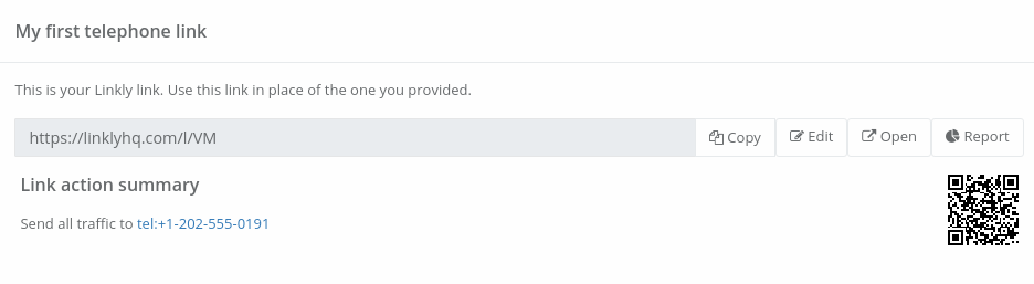 - QR codes reach the Linkly link, and redirect to the tel number. This is useful as you can change the destination tel number, even if you’ve printed & distributed a QR code.